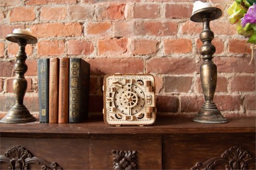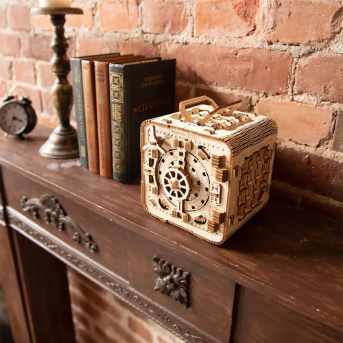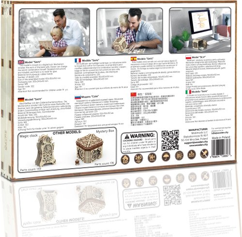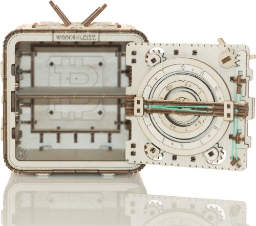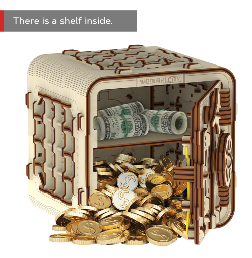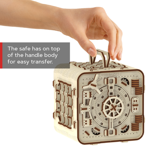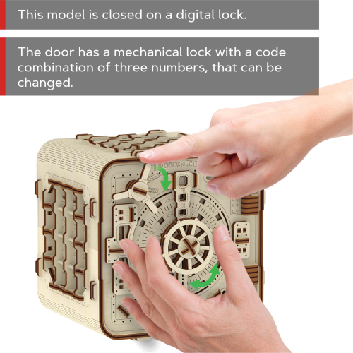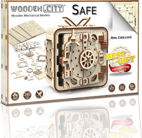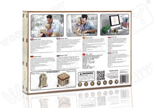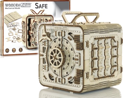 Pokud nevíte, kam bankovky schovat, bude tento model skvělou volbou. Stačí si vymyslet vlastní číselný kód a nikomu ho neříkat. Díky jedinečnému designu a překvapivým detailům tohoto modelu bude vaše trávení času plné zábavy a skvělých emocí. Některé funkce sestaveného modelu: ⠀ - mechanismus napodobuje činnost bankovního trezoru; - trezor má na horní části těla rukojeť pro snadné přenášení; - uvnitř je polička; - dveře mají mechanický zámek s kódovou kombinací tří čísel; - číselnou hodnotu kódu lze kdykoli změnit; - v případě, že jste zapomněli heslo, můžete použít tajnou funkci a trezor otevřít (tento způsob je popsán v návodu). 3D puzzle WOODEN CITY Safe je neobvyklým dárkem pro milovníky krásy a překvapení. Obtížnost: 4 z 5 (dle rozdělení Wooden City) Orientační doba na složení: 4 hodiny Dřevěné 3D puzzle WOODEN CITY jsou detailně propracované funkční mechanické modely, které se skládají bez lepidla nebo nářadí. Jsou vyrobeny z ekologických dřevěných materiálů - kvalitní březové překližky. S mechanickými dřevěnými puzzle WOODEN CITY zažijete hodiny zábavy při skládání a poznáte převody, gumičkové motory, ozubená kolečka a další součástky z bezprostřední blízkosti.