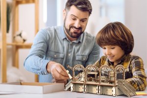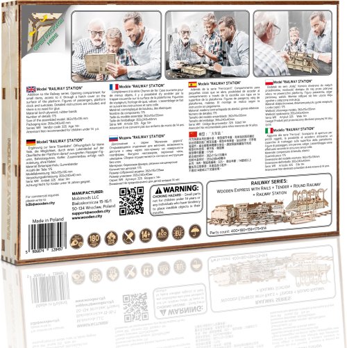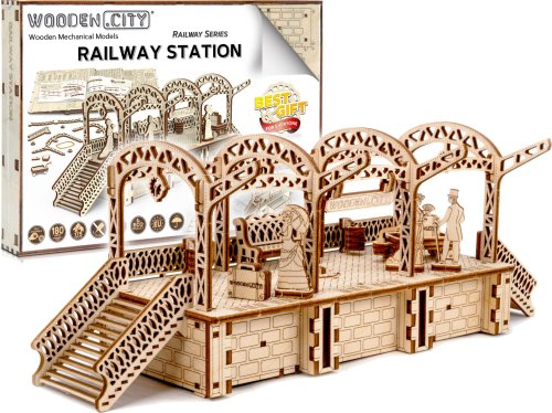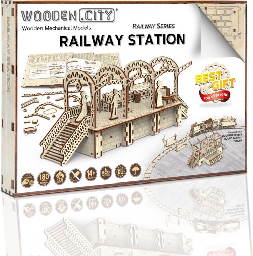 3D puzzle WOODEN CITY Railway Station je neobvyklým dárkem pro vaše blízké a milovníky světa na kolejích. Obtížnost: 4 z 5 (dle rozdělení Wooden City) Orientační doba na složení: 3 hodiny Dřevěné 3D puzzle WOODEN CITY jsou detailně propracované funkční mechanické modely, které se skládají bez lepidla nebo nářadí. Jsou vyrobeny z ekologických dřevěných materiálů - kvalitní březové překližky. S mechanickými dřevěnými puzzle WOODEN CITY zažijete hodiny zábavy při skládání a poznáte převody, gumičkové motory, ozubená kolečka a další součástky z bezprostřední blízkosti.