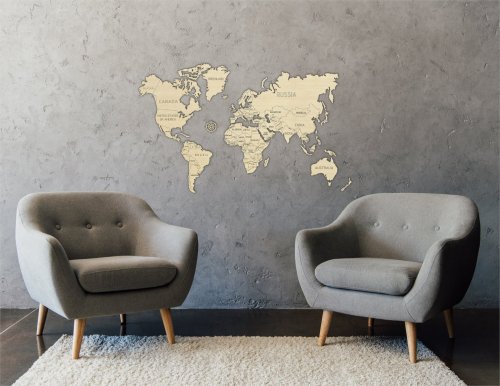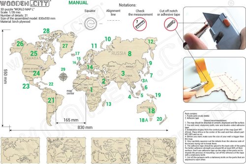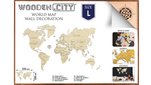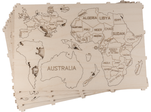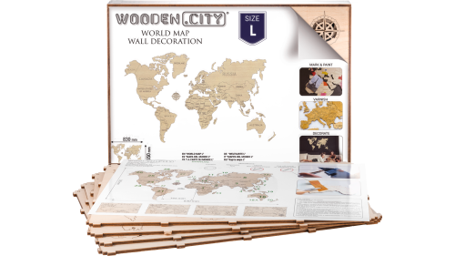 Dřevěné "puzzle" zobrazující mapu celého světa je určeno především jako dekorační prvek nebo stylový dárek nejen pro cestovatele. Nástěnná mapa se stane světem vzpomínek, zážitků a dobrodružství. Pomocí oboustranné lepicí pásky ji snadno umístíte doma nebo třeba v kanceláři. Originální dřevěná mapa světa je vyřezaná laserem z kvalitní břízové překližky. Navštívená místa můžete třeba vybarvit nebo do dřeva zapíchnout špendlík s vlaječkou.
