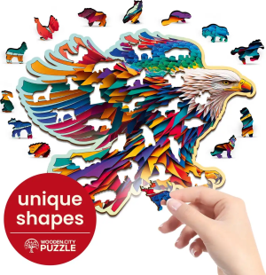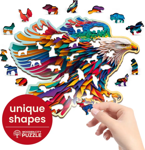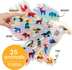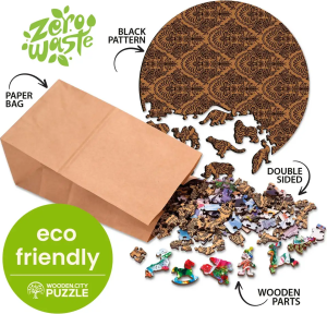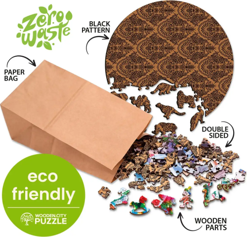 Laserem vyřezávané dřevěné puzzle WOODEN CITY se svými speciálně tvarovanými dílky je neskutečně zábavné. Část dílků je vyrobena ve tvaru zvířat , jejichž výsledný efekt umocňují laserem zvýrazněné detaily. Tyto dílky mohou samostatně stát jako drobné figurky. Skládání puzzle s různotvarými dílky je obtížnější a představuje větší výzvu, než skládání klasického puzzle. Značka WOODEN CITY kromě unikátního konceptu puzzle nezapomíná na ekologii, u těchto výrobku proto nenaleznete žádné plastové obaly .