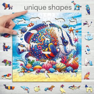 Laserem vyřezávané dřevěné puzzle WOODEN CITY se svými speciálně tvarovanými dílky je neskutečně zábavné. Část dílků je vyrobena ve tvaru zvířat , jejichž výsledný efekt umocňují laserem zvýrazněné detaily. Tyto dílky mohou samostatně stát jako drobné figurky. Skládání puzzle s různotvarými dílky je obtížnější a představuje větší výzvu, než skládání klasického puzzle. Značka WOODEN CITY kromě unikátního konceptu puzzle nezapomíná na ekologii, u těchto výrobku proto nenaleznete žádné plastové obaly .