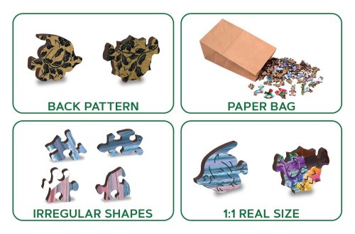s unikátně tvarovanými dílky představující známé stavby, předměty nebo zvířata podle tématu motivu vyšší obtížnost při menším počtu dílků - skládání puzzle s různotvarými dílky je náročnější oboustranné puzzle 2v1 - z jedné strany je obrázek, z druhé opakující se vzor pro skládání podle tvaru hladké hrany bez třísek díky preciznímu laserovému zpracování vyrobeno z pevné dřevovláknité HDF desky o síle 3-4mm uvnitř balení je samostatná předloha na skládání EKO Friendly 100% bez plastových obalů - puzzle je v papírovém sáčku uvnitř papírové krabičky vhodný dárek pro jakoukoliv příležitost