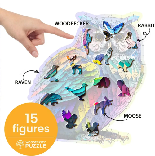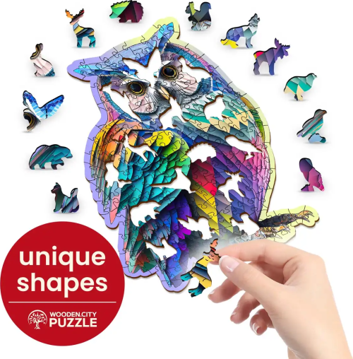 Laserem vyřezávané dřevěné puzzle WOODEN CITY se svými speciálně tvarovanými dílky je neskutečně zábavné. Část dílků je vyrobena ve tvaru zvířat , jejichž výsledný efekt umocňují laserem zvýrazněné detaily. Tyto dílky mohou samostatně stát jako drobné figurky. Skládání puzzle s různotvarými dílky je obtížnější a představuje větší výzvu, než skládání klasického puzzle. Značka WOODEN CITY kromě unikátního konceptu puzzle nezapomíná na ekologii, u těchto výrobku proto nenaleznete žádné plastové obaly .