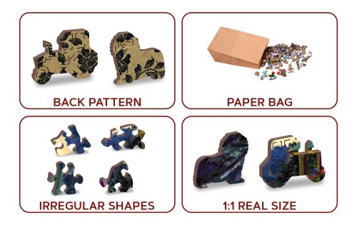 s unikátně tvarovanými dílky představující známé stavby, předměty nebo zvířata podle tématu motivu vyšší obtížnost při menším počtu dílků - skládání puzzle s různotvarými dílky je náročnější oboustranné puzzle 2v1 - z jedné strany je obrázek, z druhé opakující se vzor pro skládání podle tvaru hladké hrany bez třísek díky preciznímu laserovému zpracování vyrobeno z pevné dřevovláknité HDF desky o síle 3-4mm uvnitř balení je samostatná předloha na skládání EKO Friendly 100% bez plastových obalů - puzzle je v papírovém sáčku uvnitř papírové krabičky vhodný dárek pro jakoukoliv příležitost