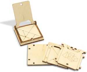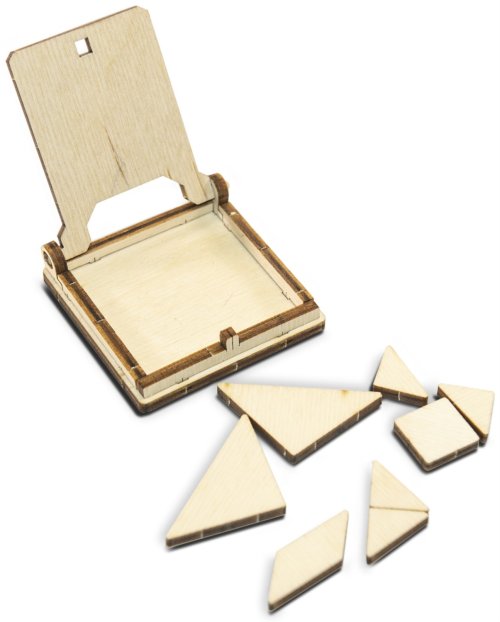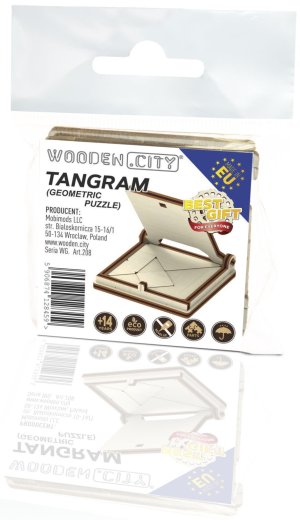 Dřevěné 3D puzzle, které po složení poslouží jako kapesní hlavolam pro jednoho k ukrácení dlouhé chvíle. Tangram je čtverec, jehož historie sahá až do doby před 3000 lety. Je promyšleně rozdělený na sedm geometrických částí, z nichž lze sestavovat různé siluety zvířat, lidských postav nebo věcí. I samotné umístění tangramu do krabičky je malým hlavolamem. Tento výrobek neobsahuje předlohy, ty lze volně najít na internetu.