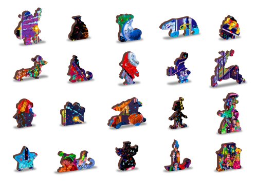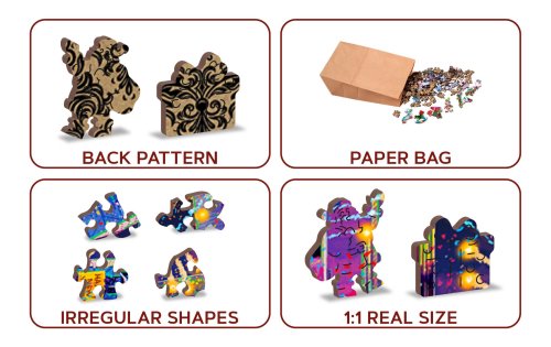 s unikátně tvarovanými dílky představující známé stavby, předměty nebo zvířata podle tématu motivu vyšší obtížnost při menším počtu dílků - skládání puzzle s různotvarými dílky je náročnější oboustranné puzzle 2v1 - z jedné strany je obrázek, z druhé opakující se vzor pro skládání podle tvaru hladké hrany bez třísek díky preciznímu laserovému zpracování vyrobeno z pevné dřevovláknité HDF desky o síle 3-4mm uvnitř balení je samostatná předloha na skládání EKO Friendly 100% bez plastových obalů - puzzle je v papírovém sáčku uvnitř papírové krabičky vhodný dárek pro jakoukoliv příležitost