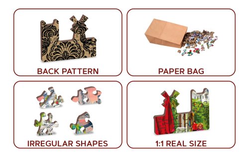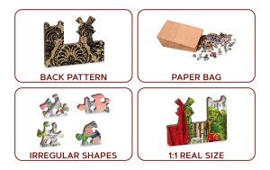 s unikátně tvarovanými dílky představující známé stavby, předměty nebo zvířata podle tématu motivu vyšší obtížnost při menším počtu dílků - skládání puzzle s různotvarými dílky je náročnější oboustranné puzzle 2v1 - z jedné strany je obrázek, z druhé opakující se vzor pro skládání podle tvaru hladké hrany bez třísek díky preciznímu laserovému zpracování vyrobeno z pevné dřevovláknité HDF desky o síle 3-4mm uvnitř balení je samostatná předloha na skládání EKO Friendly 100% bez plastových obalů - puzzle je v papírovém sáčku uvnitř papírové krabičky vhodný dárek pro jakoukoliv příležitost