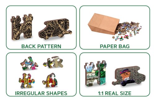 s unikátně tvarovanými dílky představující známé stavby, předměty nebo zvířata podle tématu motivu vyšší obtížnost při menším počtu dílků - skládání puzzle s různotvarými dílky je náročnější oboustranné puzzle 2v1 - z jedné strany je obrázek, z druhé opakující se vzor pro skládání podle tvaru hladké hrany bez třísek díky preciznímu laserovému zpracování vyrobeno z pevné dřevovláknité HDF desky o síle 3-4mm uvnitř balení je samostatná předloha na skládání EKO Friendly 100% bez plastových obalů - puzzle je v papírovém sáčku uvnitř papírové krabičky vhodný dárek pro jakoukoliv příležitost