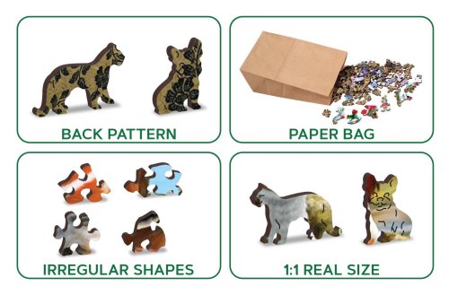 s unikátně tvarovanými dílky představující známé stavby, předměty nebo zvířata podle tématu motivu vyšší obtížnost při menším počtu dílků - skládání puzzle s různotvarými dílky je náročnější oboustranné puzzle 2v1 - z jedné strany je obrázek, z druhé opakující se vzor pro skládání podle tvaru hladké hrany bez třísek díky preciznímu laserovému zpracování vyrobeno z pevné dřevovláknité HDF desky o síle 3-4mm uvnitř balení je samostatná předloha na skládání EKO Friendly 100% bez plastových obalů - puzzle je v papírovém sáčku uvnitř papírové krabičky vhodný dárek pro jakoukoliv příležitost