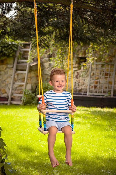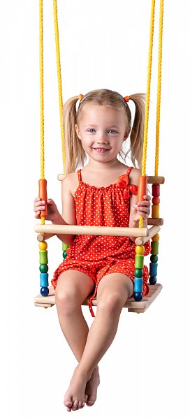 Houpačka pro nejmenší děti je vyrobena z masivního dřeva Je opatřena bezpečnostní ohrádkou Zvednutím přední tyčky ohrádky se dítě snadno dostane dovnitř i ven Houpačka má nastavitelnou délku lan
