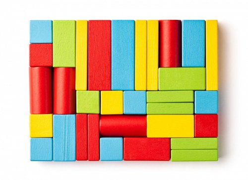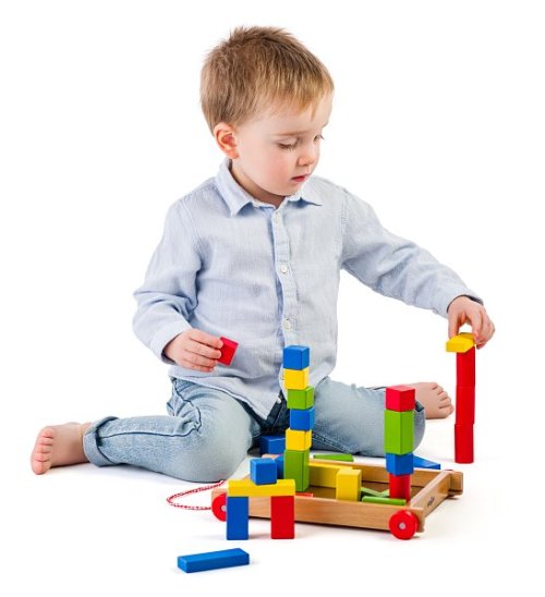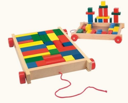 Vozík obsahuje 34 barevných kostek Dítě se učí rozlišovat jejich barvy a tvary, stavět s nimi a rovnat je zpět do vozíku Hračka rozvíjí jemnou motoriky a logiku