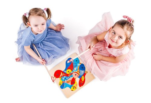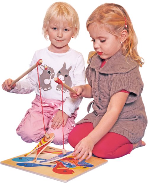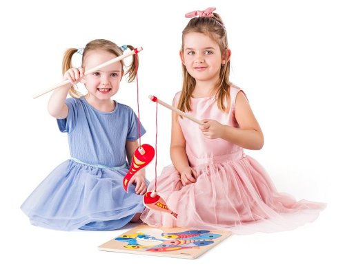 Chytání rybiček WOODY Rybičky s udičkou Dřevěný proutek s magnetem zavěšeným na provázku, na který se musí nachytat rybičky Hra rozvíjí dítě ve dvou fázích Jde o soutěživou hru, kdo naloví pomocí magnetků …