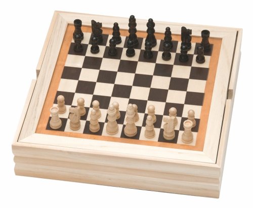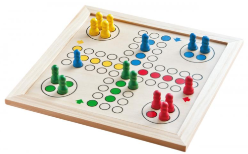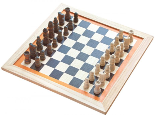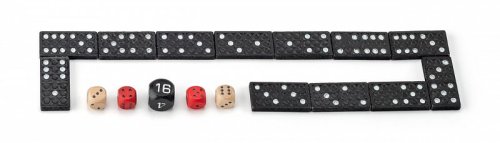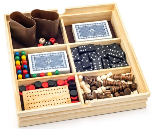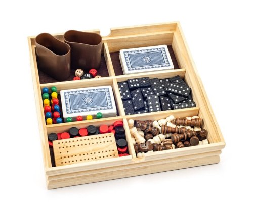 Několik stolních her v jednom dřevěném boxu Šachy, dáma, člověče nezlob se, vrchcáby, backgammon, mlýn, kameny pro domino, kostky a karty Obsahuje i návody ke hrám
