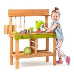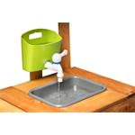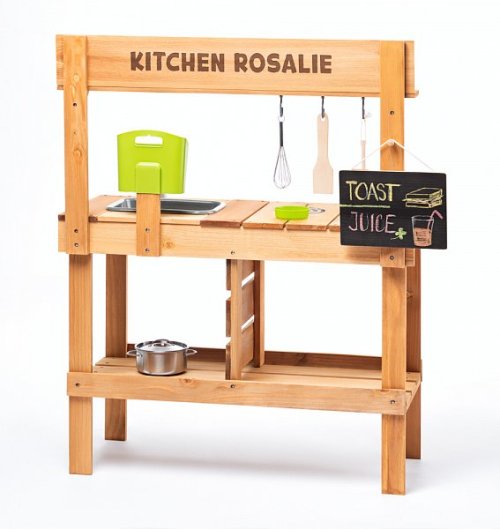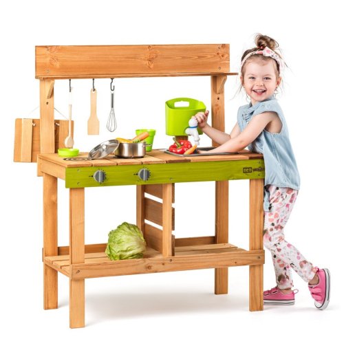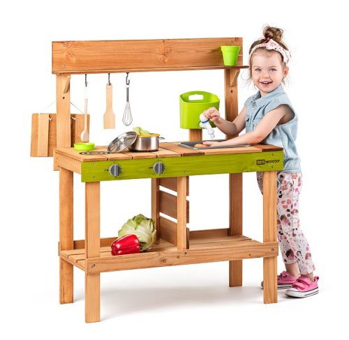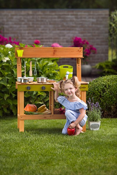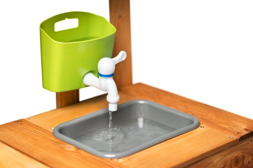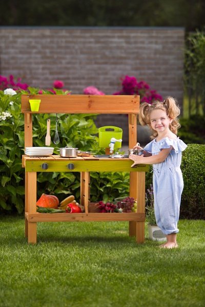 Z jedné strany kuchyňka se dvěma vařiči, z druhé výdejna jídel Součástí kuchyňky je zásobník na vodu Díky němuž může dítě skutečně omývat ovoce, zeleninu, ale i nádobí a náčiní, které je součástí tohoto výrobku Hra s vodou děti nadchne a plnění zásobníku se tak stane velmi populární činností Dřez pod kohoutkem je vyjímatelný a může se tak vylévat dle potřeby Pod dřezem je prostor pro uskladnění zásob na přípravu pokrmů Na černou tabulku z výdejní strany kuchyně mohou děti napsat či nakreslit, jaké jídlo dnes pro své kamarády připravily Zahradní kuchyňka je ošetřená glazurou vhodnou pro děti a je šetrná k životnímu prostředí