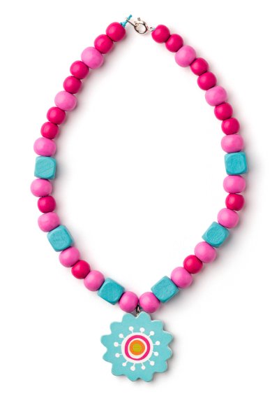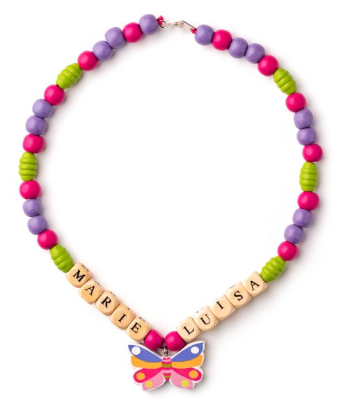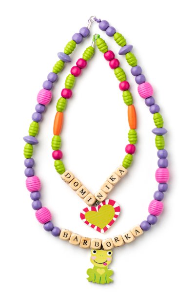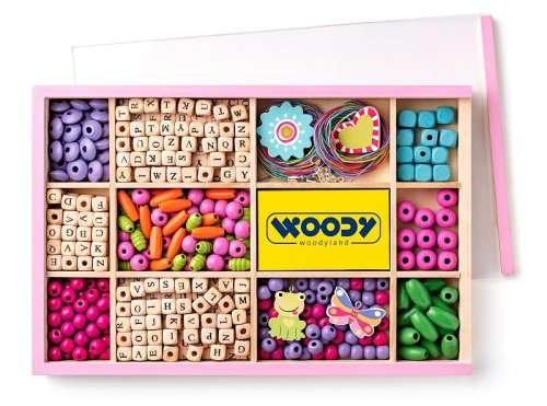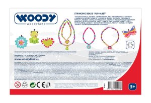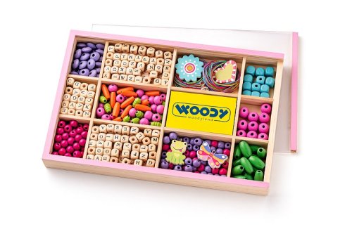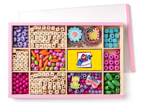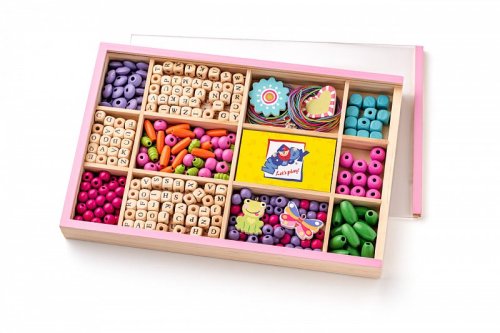 Barevné korálky různých tvarů, korálky s motivem ABC, květin, srdíček, zvířátek a šňůrky k navlékání se zapínáním Vše je umístěno v praktické dřevěné krabičce se zasouvacím víkem z plexiskla