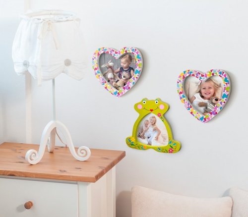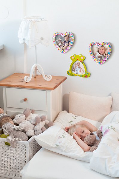 Dřevěná žabka, ve které jsou korálky umístěny, slouží zároveň jako rámeček na fotografii Rámeček je vybaven kováním na zavěšení
