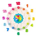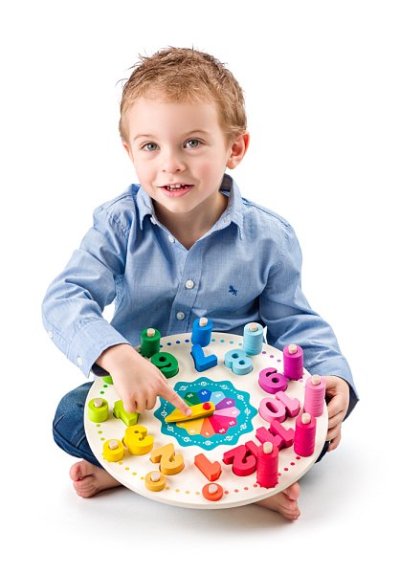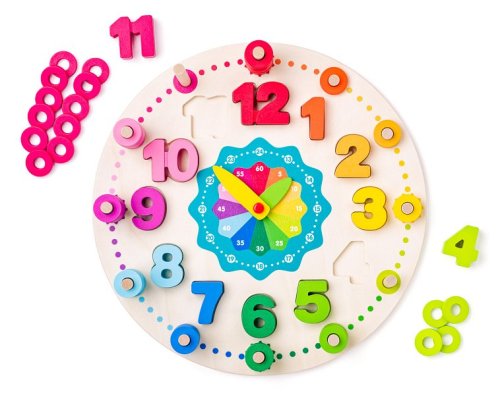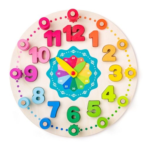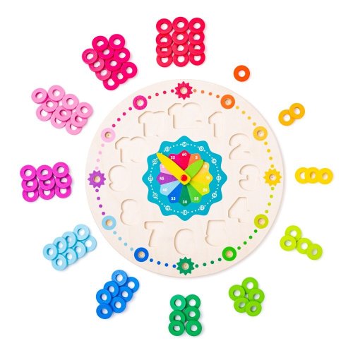 Didaktická hračka, se kterou se dítě naučí vnímat hodiny jako pomůcku pro měření času Naučí se poznávat číslice a díky barevným kroužkům i hodnotu, kterou představují