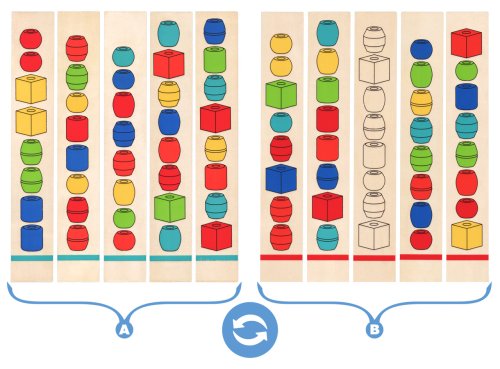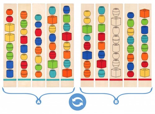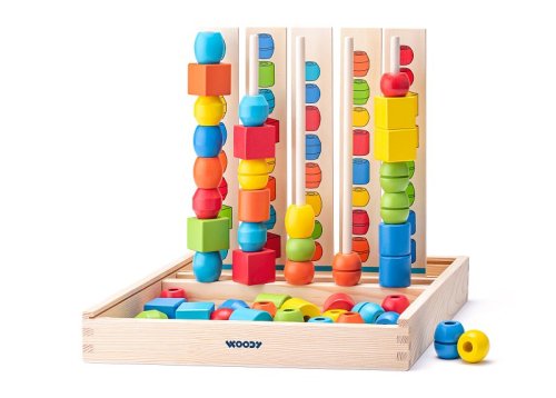 Dítě dle předlohy nakreslené na dřevěných destičkách navléká na tyčku barevné korále tak, aby odpovídaly předloze Rozhodující je zde barva, tvar a pořadí korálků