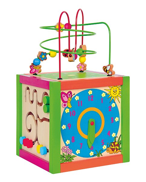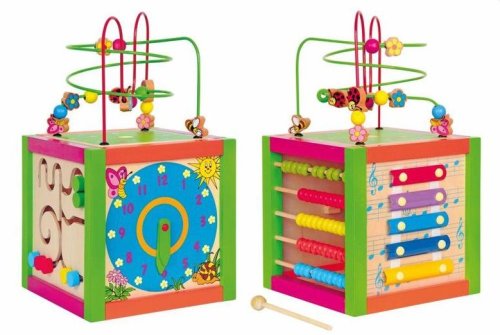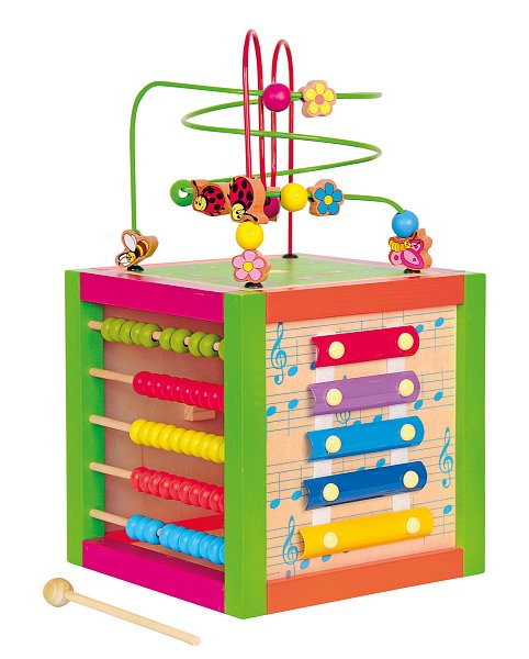 Didaktická pomůcka, logická hračka Výborné pro rozvoj motorických schopností dítěte Obsahuje xylofon s paličkou, hodiny, počítadlo, bludiště V horní části je labyrint s korálky, které je možné posouvat po drátěné konstrukci Po ukončení hry se strana s labyrintem zaklopí dovnitř pro snadné uskladnění hračky