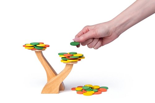 Hra a didaktická pomůcka v jednom Hráči hází kostkou, na jejíž stranách jsou barevné puntíky Barva puntíku hráči napoví, které kolečko musí na strom položit Úkolem hráče je položit na strom kolečko tak, aby nespadlo a nesvrhlo s sebou zbytek již umístěných koleček Hráč musí správně zvolit i velikost kolečka, které je pro něj v dané situaci nejvýhodnější Hra obsahuje 180 barevných koleček