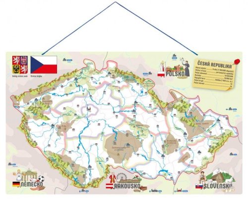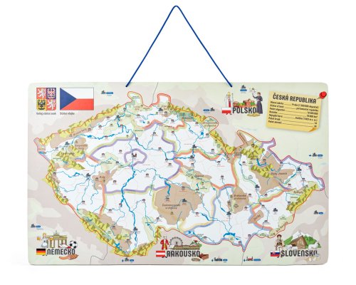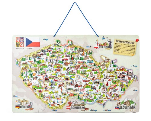 Naučné puzzle, školní pomůcka a společenská hra v jednom Cílem je naučit vnímat dítě naši republiku jako stát, který je plný zajímavostí Současně se zde dítě naučí rozčlenit naši republiku do jednotlivých okresů a určit jejich hlavní města Na podkladové desce jsou rovněž zakresleny řeky a pohoří Dítě přikládá dílky znázorňující jednotlivé okresy na podkladovou magnetickou plochu Hranice jednotlivých okresů jsou vyznačeny tenkou červenou linkou, podle které dítě jednoduše určí, kam který díl patří