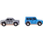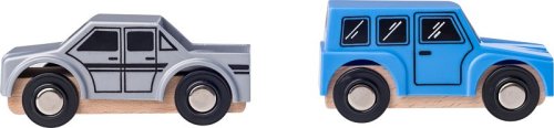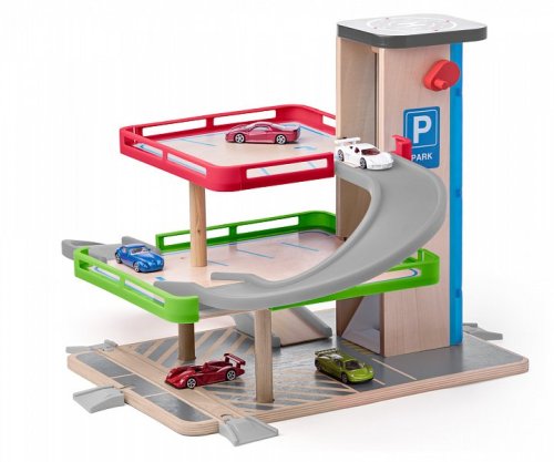 Sada obsahuje 7 dílů: 2 autíčka v dřevěno-plastovém provedení a magnetem na propojení 2 plastové sjezdy mezi patry Plastové zábradlí Dřevěné parkovací plochy 4 plastové koncovky pro sjezd/vjezd do garáže
