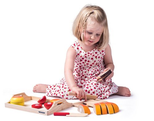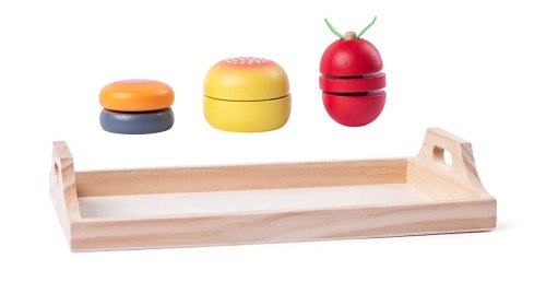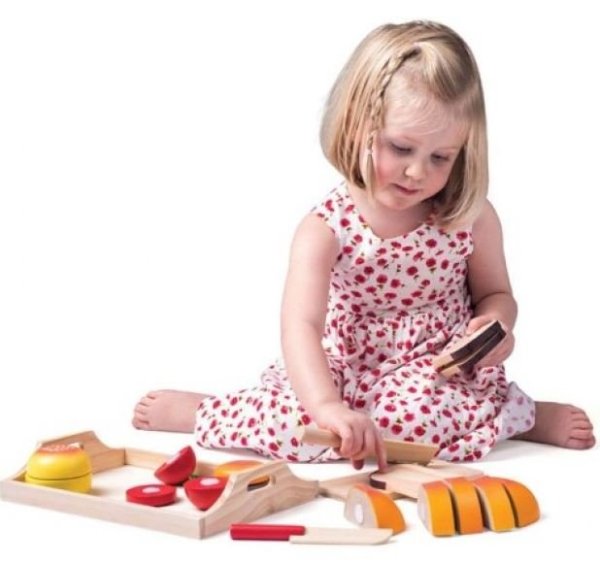 Všechny potraviny na dřevěném táce jsou složeny z částí spojených suchými zipy Potraviny lze takto opakovaně krájet a znovu skládat Ideální hračka pro rozvoj motoriky a logického myšlení