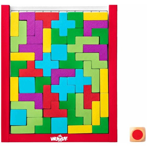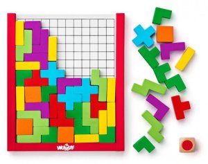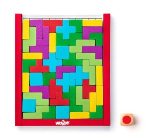 Dítě hází kostkou a podle hozené barvy vkládá jednotlivé kousky skládanky do krabičky Skládá je tak, aby do sebe správně zapadaly a nevytvářely se prázdná místa