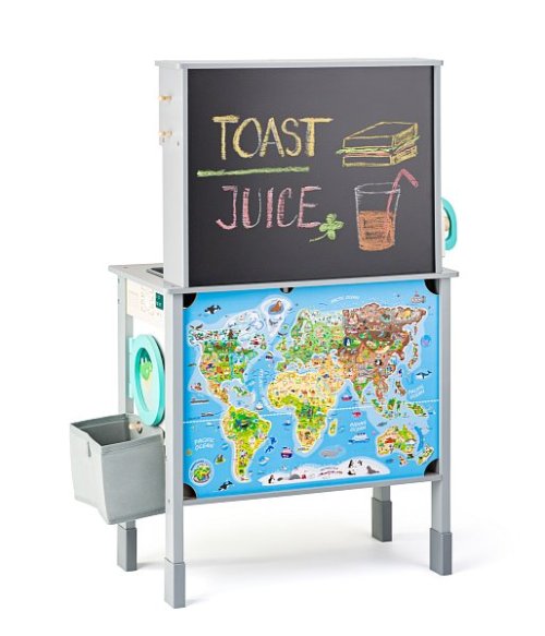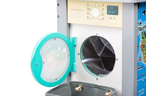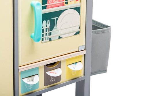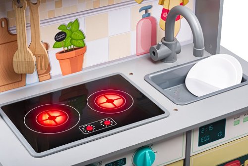 Tato multifunkční kuchyňka nabízí z každé své strany jinou aktivitu Z čelní strany obsahuje troubu, mikrovlnku se světlem a zvukem, kávovar, myčku, dřez i varnou desku Varná deska je podsvícena červeně a má zvuky reálného vaření Z pravého boku najde dítě pračku s košem na prádlo Z levého boku pak žehlící prkno se žehličkou Zadní strana je tvořena tabulí a mapou Jako bonus jsou součástí tohoto výrobku i kartičky s obrázky odpadků Ty dítě třídí a vkládá do správných otvorů pro tříděný odpad Příslušenstvím je nádobí z kvalitního plastu a dřeva Mezi doplňky patří zástěra s kuchařskou čepicí Baterie 2x AA, 2x AAA (nejsou součástí balení)
