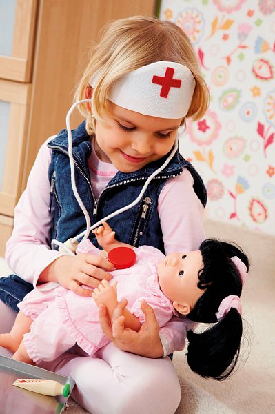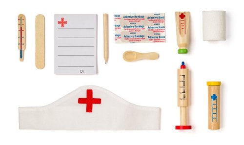 Obsah kufříku: 1 doktorská čepička, 1 fonendoskop, 1 injekci, 1 teploměr, 1 obvaz, 1 tuba krému (dřevěná replika), 1 tuba na léky, 1 lžičku, 1 tužka a 1 špachtli.
