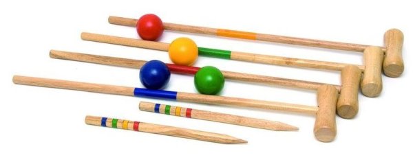 Balení obsahuje: 4 dřevěné palice, 4 dřevěné koule, 2 dřevěné kolíky, 10 drátěných branek a návod ke hře.