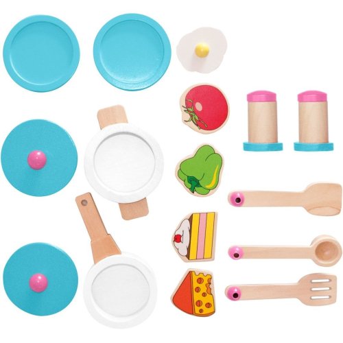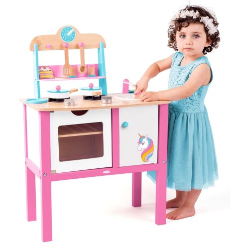 Dřevěná kuchyňka s motivem jednorožce obsahuje velké množství příslušenství (hrnec, pánev, slánka, pepřenka, naběračka, poklice,....).