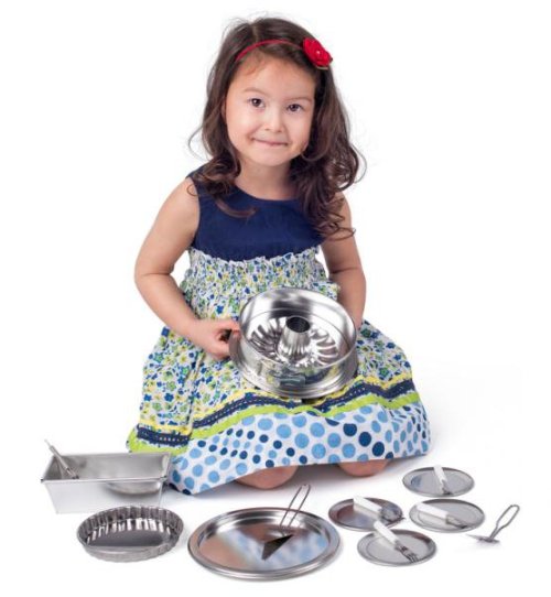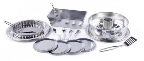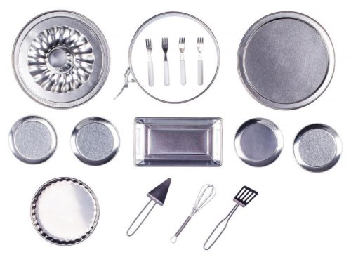 Obsah balení: dětskou kovovou formu na bábovku, čtyři talířky, metličku na šlehání, vidličky, další pečící formy a doplňky, celkem 16 dílků.