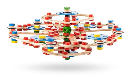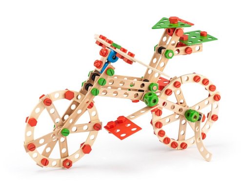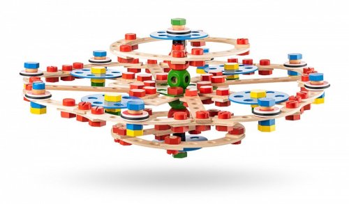 Montážní stavebnice "Engeneer" nabízí dětem konstrukční hru s nekonečným množstvím variant různých staveb od strojů a dopravních prostředků přes domečky , jeřáby až po létající talíře, mosty, věže atd. Obsahuje obrovské množství vysoce kvalitních dřevěných dílů ( dřevěné destičky v různých tvarech, matice, šrouby, kolečka, podložky, šroubovák a montážní klíč, atd...), se kterými se snadno pracuje a které po zatažení šroubů vytvoří pevnou konstrukci. Věk: 3+. Velikost dílku se 6ti dírkami: 22 cm, velikost obdélníkové destičky: 18,5 x 11 cm. Počet ks: 340