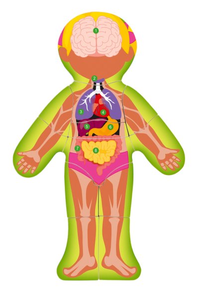 Dřevěné puzzle s motivem lidského těla. Edukativní puzzle, které seznamuje se stavbou lidského těla a lidských orgánů. Dvanáctidílkové puzzle s dívkou, které má na rubu jednotlivých dílků vyznačeny lidské orgány. Dílky vložíte do podkladového obrázku, kde je zobrazena stavba lidské kostry. Na podkladovém obrázku je také uveden číselný seznam orgánů a lidských kostí. Vhodné pro děti od 3 let. Poznámka: Puzzle obsahuje návzy jednotlivých orgánů a kostí v anglickém jazyce.