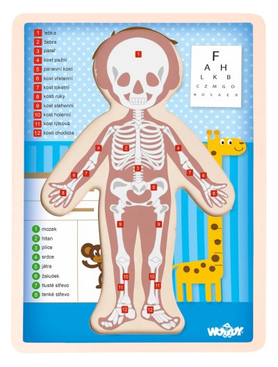Dřevěné puzzle s motivem lidského těla. Edukativní puzzle, které seznamuje se stavbou lidského těla a lidských orgánů. Dvanáctidílkové puzzle s chlapcem, které má na rubu jednotlivých dílků vyznačeny lidské orgány. Dílky vložíte do podkladového obrázku, kde je zobrazena stavba lidské kostry. Na podkladovém obrázku je také uveden číselný seznam orgánů a lidských kostí. Vhodné pro děti od 3 let.