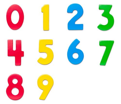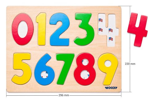 Dřevěná barevná vkládačka bez úchytek pro děti pro první seznamování s čísly a číslicemi. Pod každou číslicí je zároveň vyobrazen odpovídající počet obrázků. Jednotlivé dílky (číslice) se umisťují do vyfrézovaných obrysů na dřevěnou desku.