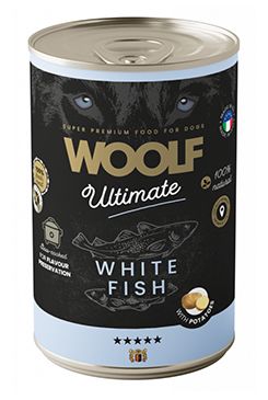 Kompletní krmivo pro dospělé psy, vlhké krmivo s bílou rybou a bramborami.