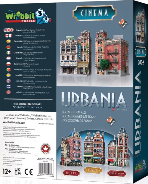 Postavte si vlastní městečko se stylovými budovami! Poskládejte si budovu kina, jednu ze čtyř částí z kolekce Urbania od kanadského výrobce Wrebbit. Roztřiďte, složte a vytvořte 3D model. Trojrozměrné puzzle WREBBIT kombinuje výzvu a zážitek. Puzzle se skládá podle referenčních obrázků na krabici a černobílého obrázkového návodu. Díky důmyslně navrhnutému tvaru a tloušťce dílků drží u sebe bez nutnosti lepení.