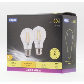 Xavax LED Filament žárovka, E27, 806 lm (nahrazuje 60 W), teplá bílá, čirá, 2 ks v krabičce