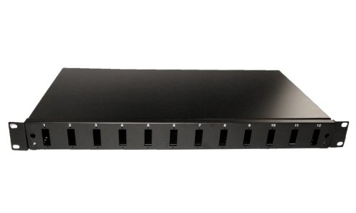 19" optický rozvaděč, barva černá, kovová skříň hloubky 245 mm, kazeta na svarky, pro 12 adaptérů SC duplex. Vana výsuvná.
