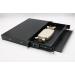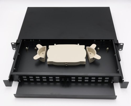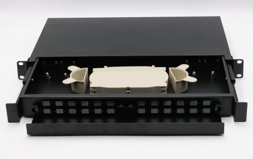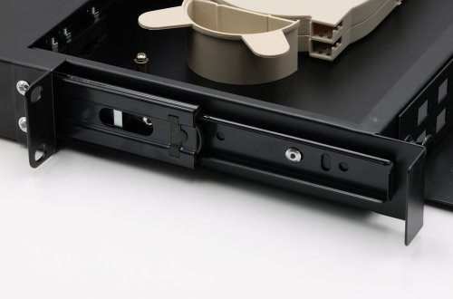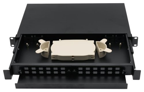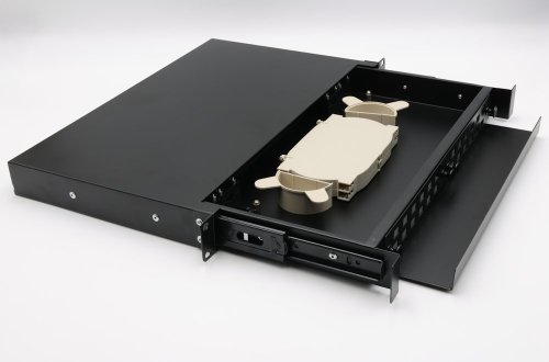 19" rozvaděč, výška 1U, pro 24 simplex adaptérů SC nebo duplexních LC, barva černá, kovová skříň, kazeta na svarky. Vana se vysouvá pomocí pojezdových kolejnic.