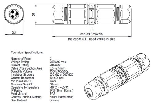 Materiál: PA6 – polyamid 6 (UV odolný), silikon (těsnění), niklovaná mosaz (kontakty)