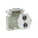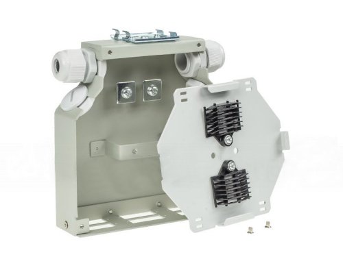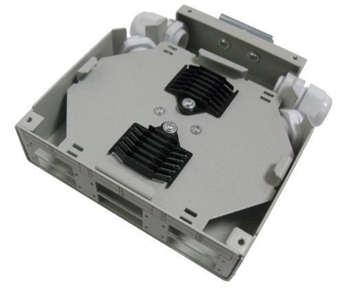 Malý kovový rozvaděč pro upevnění na DIN lištu. Dovoluje instalovat 6× SC duplexních nebo quad LC adaptérů. 4× otvor pro kabel. Kabel není nutno provlékat, lze i jen založit.