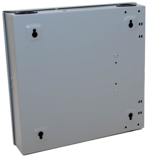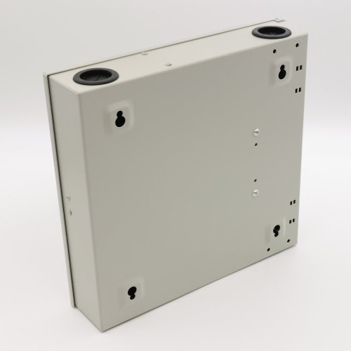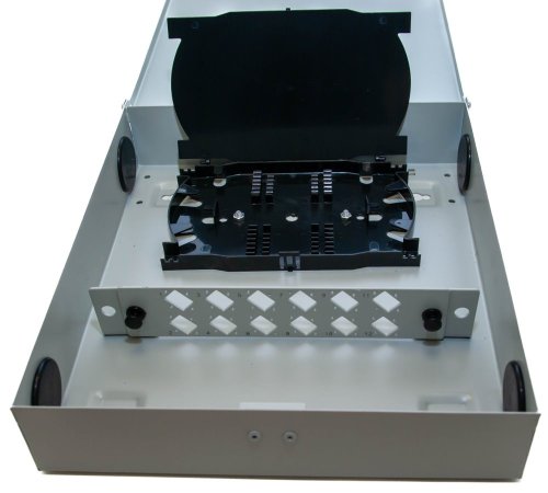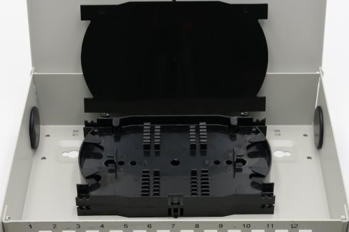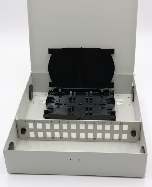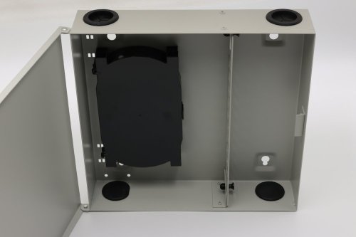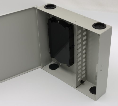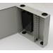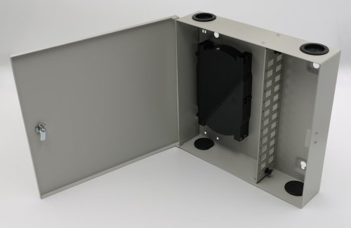 Nástěnný optický rozvaděč pro 24 vláken, 24× simplex SC nebo duplex LC, barva světle šedá, kovová skříň, kazeta na svarky, zámek.
