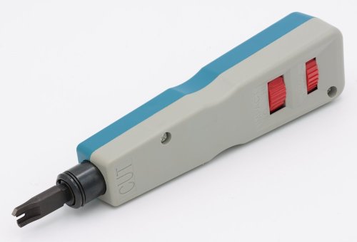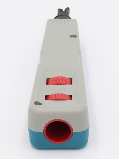 Profesionální zařezávací nástroj (nastřelovač) s nastavitelným odporem pružiny (HI/LO) pro instalaci strukturované kabeláže. Obsahuje bezpečnostní úložný prostor pro náhradní ostří (aretační mechanismus).