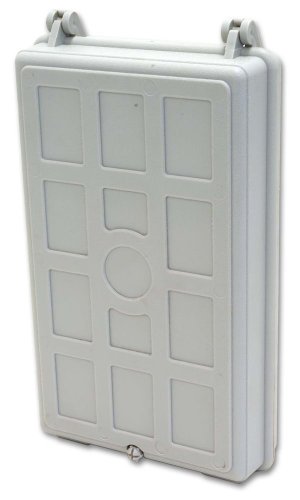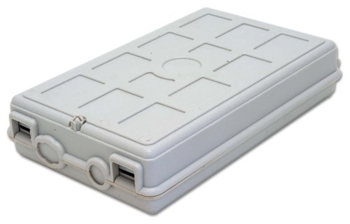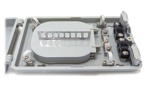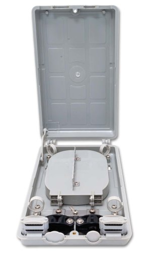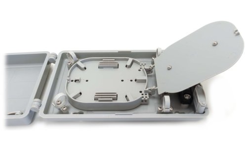 Malý plastový rozvaděč pro odbočování nebo zakončení optického vedení pomocí pigtailů, umístění 12 svarů, 2 otvory pro průchozí kabel hlavního vedení, 2 výstupní porty pro celkem 12 pigtailových napojení. Uvnitř jsou 2 kazety a každá je pro 6 svarů.