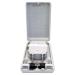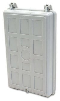 Malý plastový rozvaděč pro odbočkování nebo zakončení optického vedení pomocí pigtailů, 24 (2× 12) svarků, 2 otvory pro průchozí kabel hlavního vedení, 2 výstupní porty pro celkem 24 pigtailových napojení. Uvnitř jsou 4 kazety a každá je pro 6 svarů.