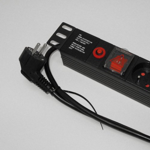 Vertikální rozvodný panel 20x 230 V, zásuvky dle ČSN, indikátor napětí, nadproudová ochrana, max. proud 16 A, výška 1U, 1,8 m přívod.