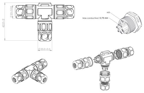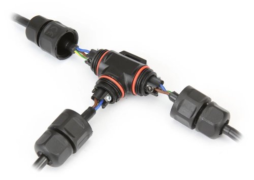 Vodotěsná spojka typu T pro drátové vodiče do průměru 2,75 mm a kabely s průměrem 5,5–8,5 mm.